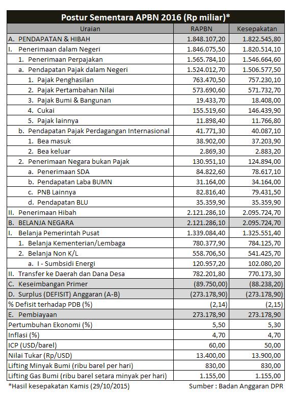 Secara umum, DPR dan pemerintah menyepakati hasil kesepakatan Panitia Kerja (Panja) Asumsi Dasar, Pendapatan, Defisit, dan Pembiayaan RAPBN 2016. Ihwal asumsi makro, misalnya, pemerintah dan DPR menyepakati asumsi pertumbuhan ekonomi 5,3%, inflasi 4,7%, dan nilai tukar rupiah Rp 13.900 per dollar Amerika Serikat (AS). Target pengangguran 5,2%-5,5% dari populasi, kemiskinan 9%-10%, gini ratio 0,39, dan indeks pembangunan manusia (IPM) sebesar 70,1.