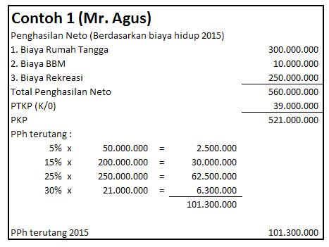 Mr. Agus memiliki status K/0. Mr. Agus merupakan seorang seniman. Pada tahun 2015, Mr. Agus mengeluarkan biaya sebesar Rp 10.0000.000 untuk membeli BBM mobil miliknya. Selain itu, untuk biaya rumah tangga Mr. Agus mengeluarkan biaya sebesar Rp 300.000.000 dalam setahun. Pada akhir tahun 2015, Mr. Agus bersama keluarganya melakukan perjalanan rekreasi dengan menghabiskan biaya sebesar Rp 250.000.000. Berdasarkan keterangan diatas, berapa jumlah PPh terutang Mr. Agus pada tahun 2015?