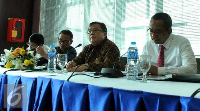 Menkeu, Bambang Brodjonegoro (tengah) didampingi PLT. Dirut Jendral Pajak Ken Dwijugiasteadi (kedua kiri) memberikan keterangan resmi terkait penerimaan pajak tahun 2015 di gedung Direktorat Pajak, Jakarta Senin, (11/1).