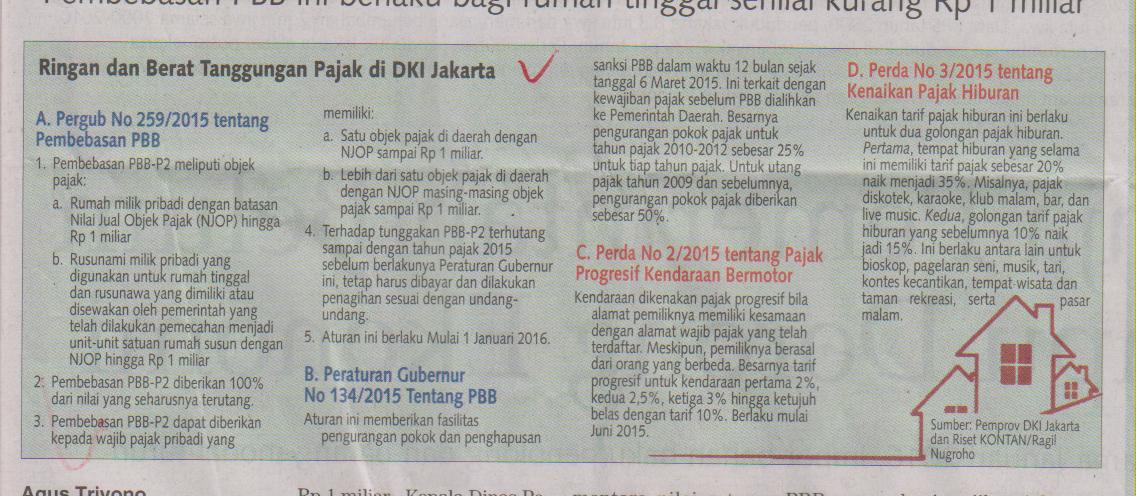 Aturan ini tertuang dalam Peraturan Gubernur (Pergub) Provinsi DKI Jakarta Nomor 259/2015 tentang Pembebasan PBB atas Rumah, Rumah Susun Sederhana Sewa dan Rumah Susun Sederhana Milik dengan NJOP sampai dengan Rp 1 miliar. Kepala Dinas Pelayanan Pajak DKI Jakarta Agus Bambang Setyowidodo mengklaim bahwa kebijakan ini bertujuan untuk meringankan beban masyarakat yang kurang mampu. “Ini untuk membantu mereka di tengah perekonomian yang sedang turun,” ujarnya, kepada KONTAN, Senin (15/2).