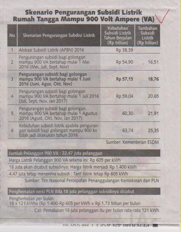 Meski menyunat subsidi bagi pemakai 900 VA dengan jumlah 18 juta pelanggan, rupanya pemerintah masih meminta tambahan subsidi. Jika alokasi subsidi setrum di APBN 2016 semula Rp 38,39 triliun, naik Rp 18,79 triliun menjadi Rp 59,04 triliun di RAPBN-P 2016. Angka ini dengan skenario ada pencabutan subsidi mulai 1 Juli 2016.
