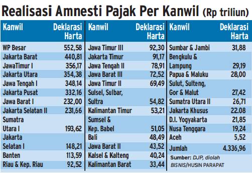 Yon Arsal, Direktur Potensi, Kepatuhan dan Penerimaan Pajak DJP mengatakan data yang tertangkap dari amnesti pajak per kanwil tersebut memang sejalan dengan data produk domestik regional bruto (PDRB). Jawa, terutama yang memuat kota-kota besar memegang porsi sangat besar dalam perekonomian.