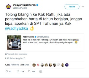 Balasan Ditjen Pajak Indonesia untuk Raffi Ahmad itu langsung viral di media sosial. Cuitan telah di-retweet sebanyak 1.263 kali dan mendapat 283 love.