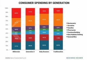 Dalam 4 kategori yang dibagi Merrill Lynch, 3 generasi dari tradisionalis, baby boomers, dan generasi X masih menghabiskan sebagian besar pengeluarannya untuk bahan makanan. Tradisionalis sebesar 30,4%, baby boomers 27,2%, dan generasi X 25,3%, dan millennial sebesar 21,7%.