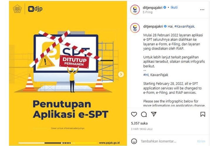 Mengutip situs pajak.go.id, Direktorat Jenderal Pajak (DJP) akan menutup saluran pelaporan SPT Tahunan melalui aplikasi e-SPT (SPT elektronik dalam bentuk “.csv”).